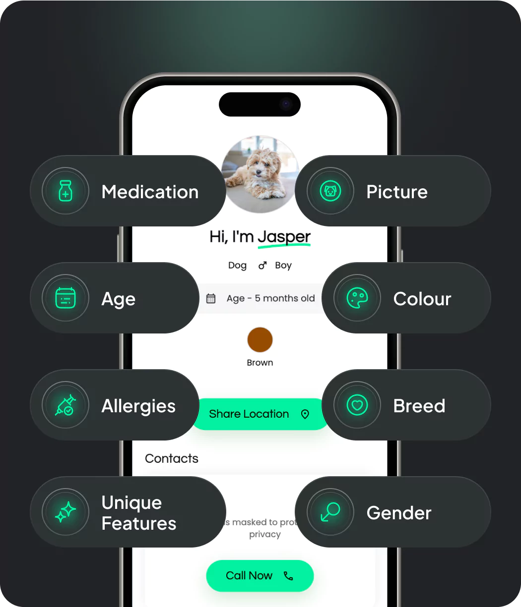 Each Orvie Tag comes with a unique QR code on the back, linking to your pet’s custom profile. This profile holds all the essential info someone needs to help return your pet safely — including your contact details, medical notes, and more. Once your tag arrives, setting up your pet’s profile takes just a few minutes.