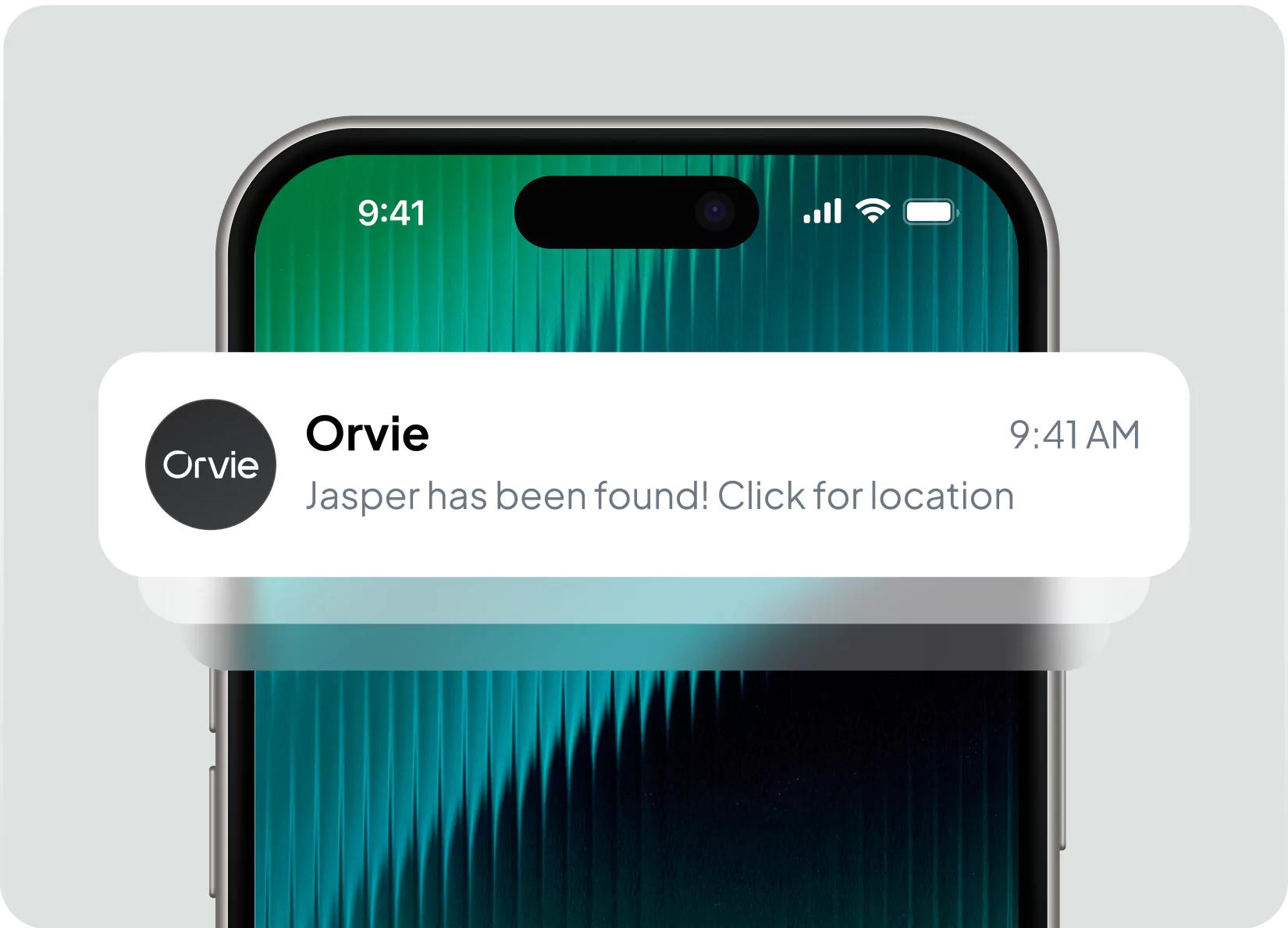 If your pet goes missing, Orvie acts fast. The moment someone scans their tag, you’ll get an instant location alert showing exactly where they were found. Their profile makes it easy for the finder to contact you directly. You can also activate extra tools like drone-assisted searches and community alerts to nearby Orvie users — helping bring your pet home quicker and safer.